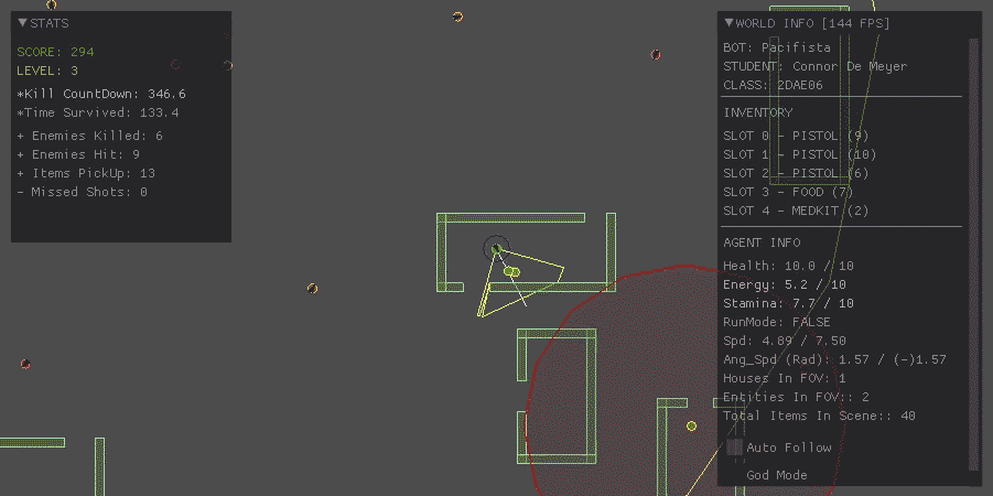 For our exam assignment we were tasked to create an AI for a simple zombie game they provided to us. We weren’t allowed to see the source code of the actual zombie game and our actor was only able to see entities in front him inside of a small cone.