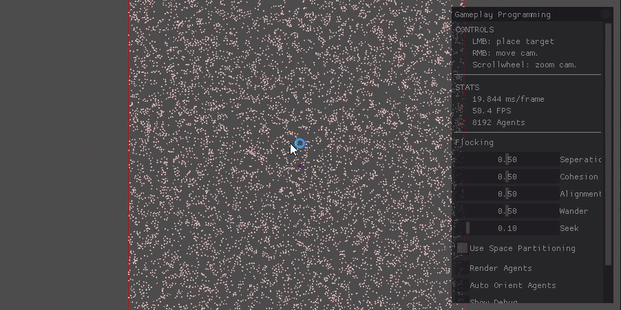 We were also informed about space partitioning, which would sort agents into squares and would drastically improve performance